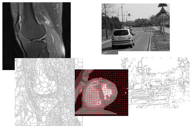 W aktywnych podziałach, jak już wcześniej wspominałem, zmieniany jest sposób reprezentacji zawartości obrazu ze zbioru pikseli na zbiór mniejszej liczby bardziej złożonych elementów. W swoich badaniach rozważałem między innymi: odcinki, elipsy i tak zwane super-piksele (małe jednolite obszary) (Rys. 2). Ta zmiana powoduje, że pojęcie konturu, intuicyjnie oczywiste w przypadku reprezentacji opartej o piksele, nie może być zastosowane. Dlatego zamiast optymalnego konturu poszukiwany jest optymalny podział zbioru elementów na te, które identyfikują poszukiwaną strukturę i te, które stanowią tło.