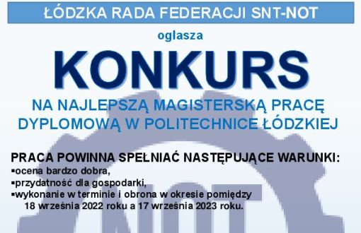 Łódzka Rada Federacji Stowarzyszeń Naukowo - Technicznych (FSNT) - NOT po raz kolejny organizuje konkurs na najlepszą pracę magisterską w Politechnice Łódzkiej, w roku akademickim 2022/2023.