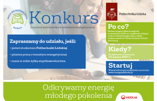 Ruszyła kolejna edycja konkursu na najlepszą pracę inżynierską, organizowanego przez firmę Veolia we współpracy z Politechniką Łódzką. Główna nagroda wynosi 5 000 zł.