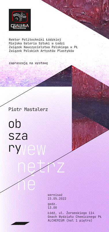 Uroczystości otwarcia Galerii Politechnika w nowym miejscu towarzyszył będzie wernisaż wystawy prac uznanego artysty dr hab. Piotra Mastalerza, profesora Politechniki Łódzkiej, zatytułowanej Obszary wewnętrzne. Prezentowane na wystawie abstrakcyjne obrazy olejne oddziaływując silnie na odbiorcę formą, kolorem i fakturą, kierują go do punktu centralnego dzieła, będącego często nieoczywistym miejscem w przestrzeni i czasie.