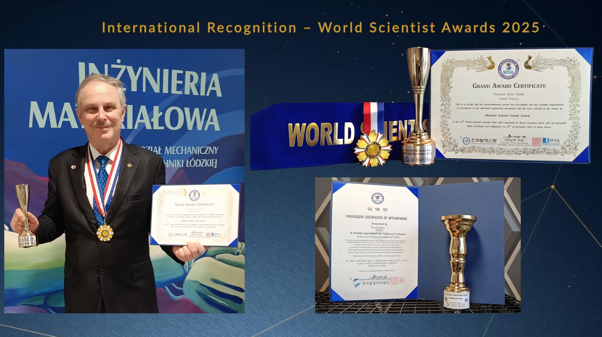 Laureat otrzymał certyfikat Grand Award, medal oraz puchar, a także tytuł Visiting Professor Korea Invention Academy.