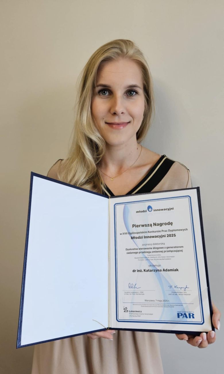 Jej rozprawa doktorska pt. „Dyskretne sterowanie ślizgowe z generatorem zadanego przebiegu zmiennej przełączającej” została najwyżej oceniona spośród wszystkich zgłoszeń w 17. edycji konkursu. Wyniki ogłoszono podczas XXIX konferencji Automation, która odbyła się w siedzibie PIAP w Warszawie.